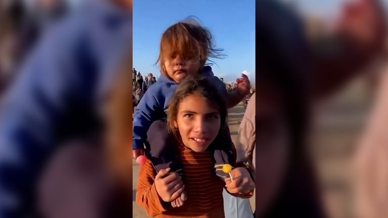 التقطت الكاميرات طفلة فلسطينية حافية القدمين تحمل شقيقتها على كتفيها في رحلة العودة إلى شمال غزة.