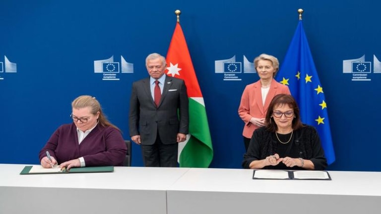 وتعقيبا على توقيع الاتفاقية، قالت فون دير لاين إن الأردن شريك أساسي للاتحاد الأوروبي في الشرق الأوسط ومنطقة المتوسط، وله دور محوري في استقرار الإقليم.