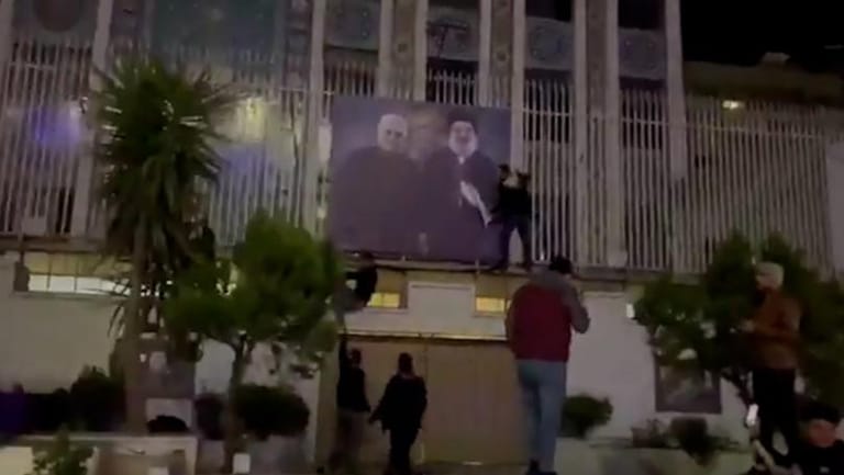 تُتابعون في الفيديو المرفق، مشاهد لإزالة صورة قائد فيلق القدس السابق التابع للحرس الثوري الإيراني قاسم سليماني، والأمين العام السابق لحزب الله السيّد حسن نصرالله، عن واجهة السفارة الإيرانية في دمشق.