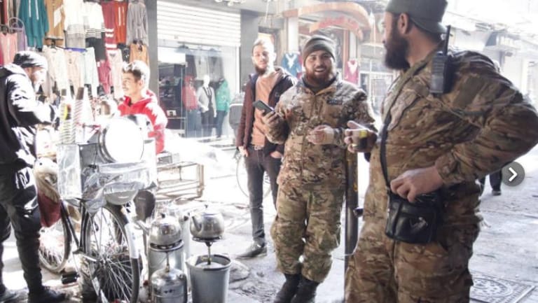 صيارفة على مدّ العين بعد أن كانت العملة الأجنبية من المحرمات. وكلّ واحد يضع سعراً على ذوقه ريثما يعود العمل إلى مصرف سوريا المركزي. سوق نصري يرحب بالمارة. ومحل بوظة بكداش الشهير وضع كثيراً من عبارات الترحيب بالثوار: "أهلاً وسهلاً بثوار سورية الحرّة". والشغل "عال العال". وعناصر أحرار سورية ببزاتهم وأسلحتهم يقفون بالصف لتناول أكواب البوظة ويلتقطون "السلفي" مع الجمهور. يقترب أحدهم منا مردداً: الله يحرس لبنان وسورية".