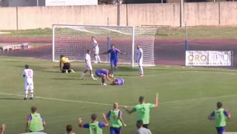 سقط لاعب روما سيتي فاقداً للوعي بعد تسجيله هدفا رائعا في شباكه فريق تيرمولي 1920، خلال فعاليات دوري الدرجة الرابعة الإيطالي.