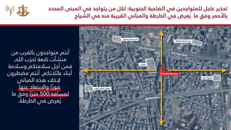 كتب المتحدث باسم الجيش الإسرائيلي أفيخاي أدرعي على منصة "أكس": "إنذار عاجل إلى سكان الضاحية الجنوبية وتحديدًا المتواجدين في المبنى المحدد في الخارطة في حي الشياح، أنتم متواجدون بالقرب من منشآت ومصالح تابعة لحزب الله حيث سيعمل ضدها جيش الدفاع على مدى الزمني القريب، من أجل سلامتكم وسلامة أبناء عائلتكم عليكم اخلاء هذا المبنى والمباني المجاورة فورًا والابتعاد عنها لمسافة لا تقل عن 500 متر".