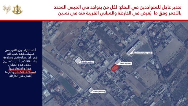 وجّه المتحدث باسم الجيش الاسرائيلي أفيخاي أدرعي "إنذاراً عاجلاً إلى سكان منطقة البقاع، وتحديدًا المتواجدين في المبنى المحدد في الخارطة والواقع في منطقة تمنين".
