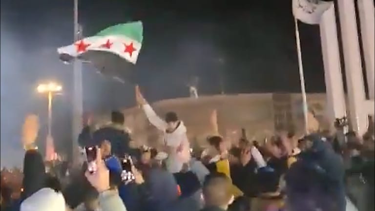 احتفالات في ساحة النور في طرابلس بعد سيطرة المعارضة السورية على حمص، في الفيديو المرفق.