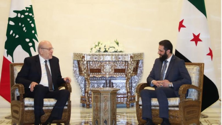 بدأ اللقاء بين رئيس حكومة تصريف الأعمال نجيب ميقاتي وقائد الإدارة الجديدة في سوريا أحمد الشرع في قصر الشعب في دمشق.