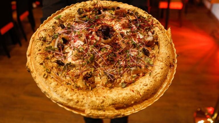 ومؤسس المطعم الإيطالي بتونس أحمد هرقال، هو من رغب في تحطيم الرقم القياسي لأغلى بيتزا في إفريقيا، وللوصول إلى هدفه لم يقم فقط بتغطية البيتزا بأوراق من الذهب عيار 24 قيراط، بل وأدخل في مكوناتها أيضا زبد الكمأة (الترافل) وجبن الموتزاريلا، وصدور البط المدخن. كما يلمع فوقها الذهب في شكل رقائق ذهبية أو رذاذ مع زهرة صالحة للأكل فوق عجينة البيتزا الشهيرة.