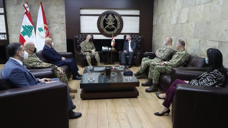 استقبل قائد الجيش العماد جوزاف عون في مكتبه في اليرزة، القائم بأعمال السفارة البريطانية في لبنان Martin LONGDEN Dr، يرافقه الملحق العسكري المقدم Alex Hilton لمناسبة إنتهاء مهامه في لبنان، وجرى خلال اللقاء تقديم الملحق العسكري الجديد المقدم LEE Richard Saunders.