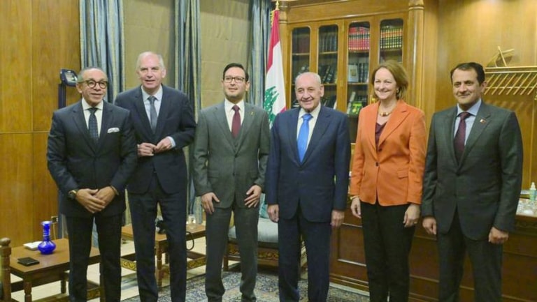 قال رئيس البرلمان نبيه بري، لـ«الشرق الأوسط» إنه توافق مع سفراء «اللجنة الخماسية» الذين التقاهم، الثلاثاء، على لبننة الاستحقاق الرئاسي، وإن «الخماسية» ما هي «إلا مجموعة دعم ومساندة للنواب لتسهيل انتخاب الرئيس، وأن لا مرشح لها ولا تضع فيتو على أي من المرشحين».