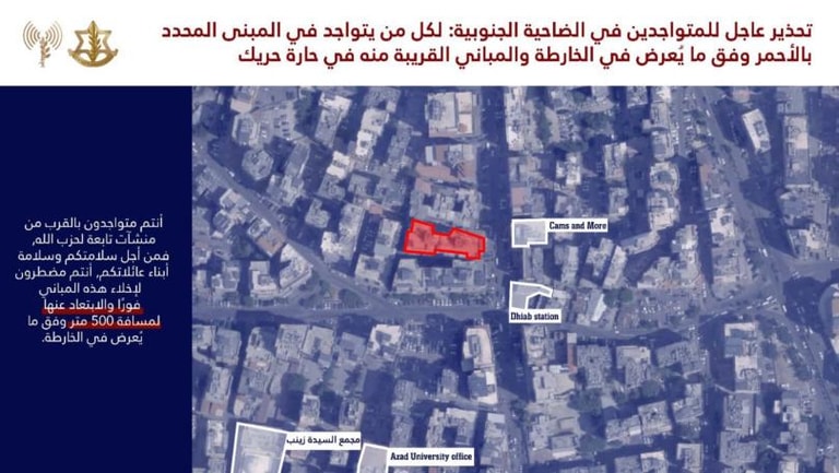 حذّر الجيش الإسرائيلي "جميع السكان المتواجدين في منطقة الضاحية الجنوبية وتحديدًا في المبنى المحدد في الخريطة المرفقة والمباني المجاورة له في منطقة حارة حريك، بضرورة الإخلاء".