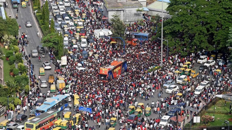 وأظهرت قنوات تلفزيونية اصطفاف آلاف الأشخاص، بعضهم يلوّح بالعلم الأحمر للفريق، في الشوارع المؤدية إلى ملعب تشيناسوامي في قلب المدينة، لدى وصول فريق الكريكيت إلى الملعب في حافلة.