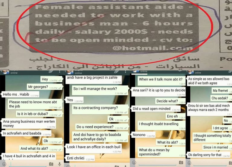 ووجدت لبنانيات كثيرات هذا الاعلان مغرياً، خصوصاً أنّ الاجر مرتفع نوعاً ما نسبةً الى تدنّي الاجور والضائقة المالية التي يمرّ بها البلد. وقد حاولت سيّدة متزوّجة التواصل مع صاحب الاعلان، فأرسلت إليه سيرتها الذاتية على بريده الالكتروني المذكور في الصحيفة، فردّ طالباً منها التواصل معه عبر "الواتس آب" نظراً الى تواجده في دبي.