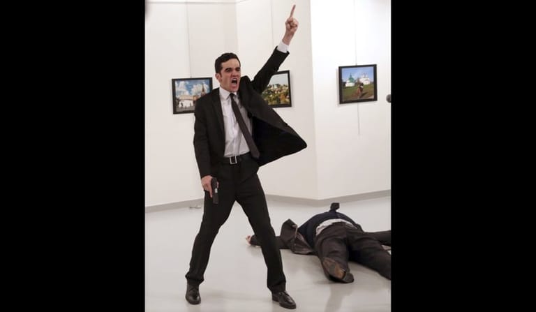 In the winning photo, the gunman, wearing a suit and tie, stands defiantly, pistol in his right hand pointed at the ground and with his left hand raised, his index finger pointing upward. His mouth is wide open as he shouts angrily. The ambassador's body lies on the floor just behind Altintas.
