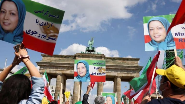 Flag-waving demonstrators rallied at Berlin's Brandenburg Gate and other locations as part of a Free Iran World Summit that featured speeches by former U.S. Secretary of State Mike Pompeo and Slovenian Prime Minister Janez Jansa.