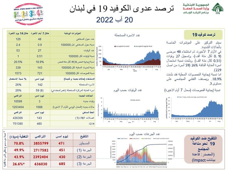 وزارة الصحة: 1088 إصابة جديدة و 3 حالات وفاة