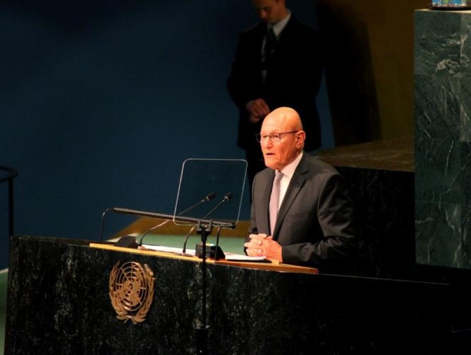وأغتنم هذه المناسبة، لأؤكد التزام لبنان القيام بدوره كاملا لتحقيق الأهداف السامية لهذه المنظمة، التي كان له شرف المساهمة في تأسيسها. وأول هذه الاهداف حفظ الأمن، ونشر السلام في العالم، وحق الشعوب في تقرير مصيرها واحترام حقوق الإنسان.