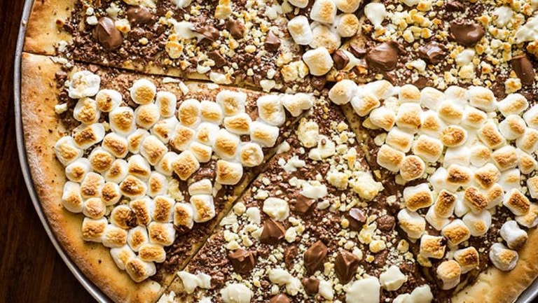 وضعي قطع الشوكولاتة والمارشملو والمكسرات فوق سطح البيتزا بعد ان تخرجيها من الفرن