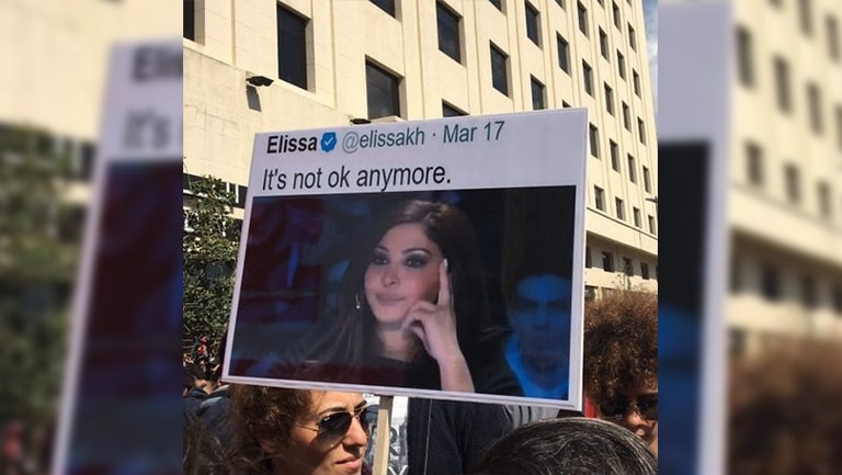 وما كان لافتاً أكثر هي اللافتة التي حملتها إحدى المتظاهرات وعليها صورة إليسا مع عبارة "It’s not ok anymore". وتجدونها في الصورة المرفقة.