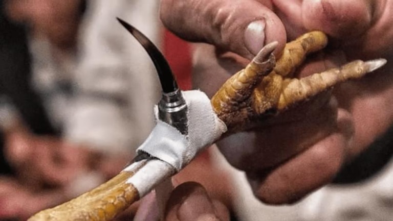 Specially-bred roosters have 7.5-centimetre (three-inch) knives or blades tethered to their legs and punters bet on who will win the gruesome fight.