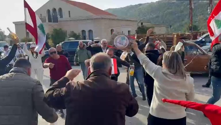 The people of Aaichiyeh are celebrating with dancing, champagne, and Lebanese flags after Army Commander Joseph Aoun was elected President of the Republic.