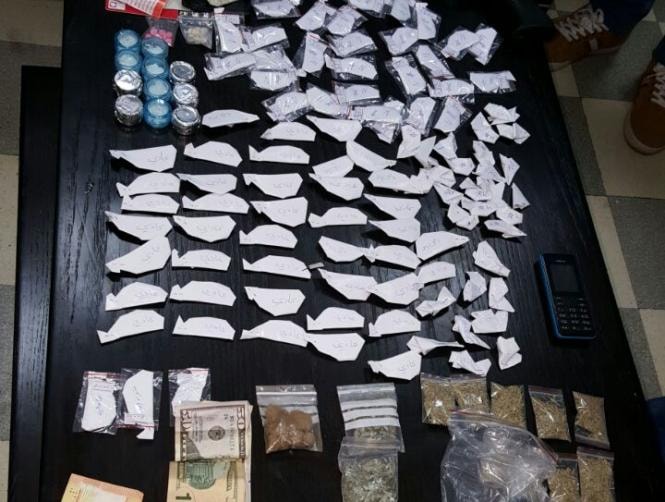 وضبط بحوزته 103 غ قائم من مادة الكوكايين ضمن 73 مظروفا ورقيا ابيض، 45 غ قائم من مادة باز الكوكايين مقسمة الى 30 مظروفا، 43 غ قائم من مادة السليفيا موضبة داخل 19 كيسا، 10غ قائم من حشيشة الكيف، كيسين يحتويان على 20 حبة "XTC" وبندقية صيد نوع "بومب اكشن" مع 11 طلقة عائدة لها صالحة للاستعمال.