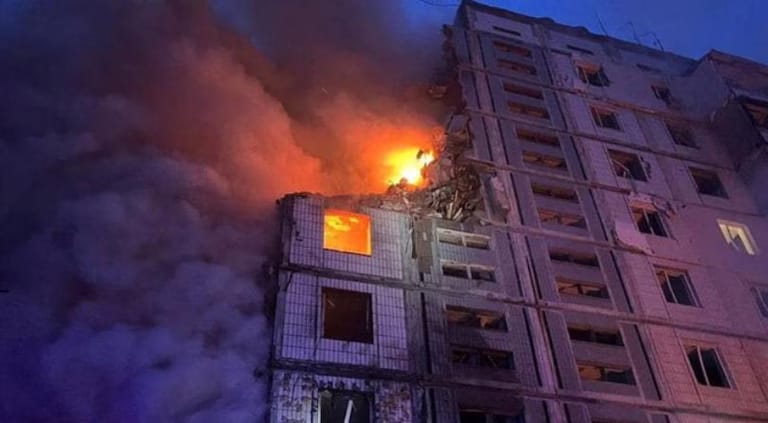 Sadovyi posted a video standing at a crater in front of a multi-storey building with all windows blasted out and scattered debris from what appearted to be a playground.