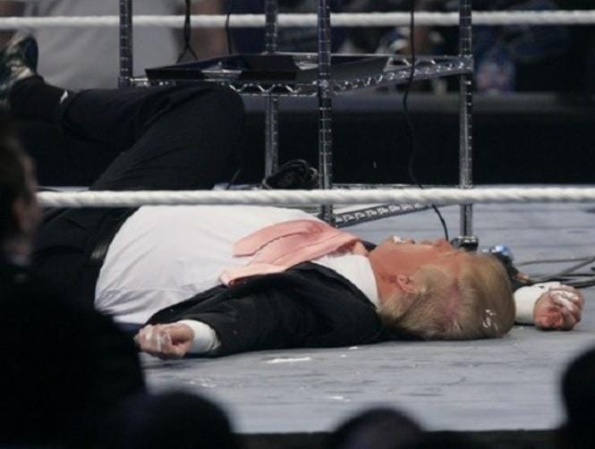 ووجّه المصارع ستيف أوستن، ضربة وهمية لترامب على مستوى البطن، قبل أن يسقطه على الأرض بطريقة استعراضية، تحت تصفيق وتشجيع الجماهير الحاضرة.