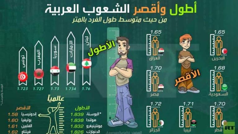 تصدّر لبنان قائمة الشعوب العربية الاكثر طولًا حسب موقع "Average Height"، بمعدّل طول 1.76 سنتيمترًا، في حين احتل مواطنو البحرين والعراق المرتبة الادنى في مؤشر الطول، بمعدّل 1.65 سنتيمترًا.