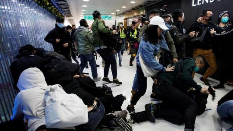 Demonstrators have been targeting malls across Hong Kong since earlier this week and more than a hundred protesters, many dressed in black with face masks, marched through a mall in Sheung Shui on Saturday, chanting “Go back to China”.