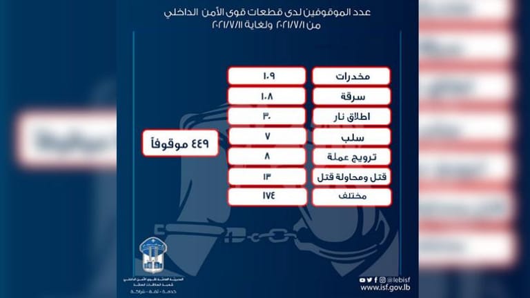 ضمن إطار مهامها في مجال حفظ الأمن والنظام ومكافحة الجريمة بمختلف أنواعها، تمكنت قطعات قوى الأمن الداخلي من تاريخ 01-07-2021 لغاية 11-07-2021، من توقيف 449 شخصًا، وذلك لارتكابهم أفعالاً جرمية مختلفة على كل الأراضي اللبنانية، ومطلوبين للقضاء بموجب مذكرات وأحكام عدلية مختلفة، وذلك وفقاً للجدول المرفق ربطاً.