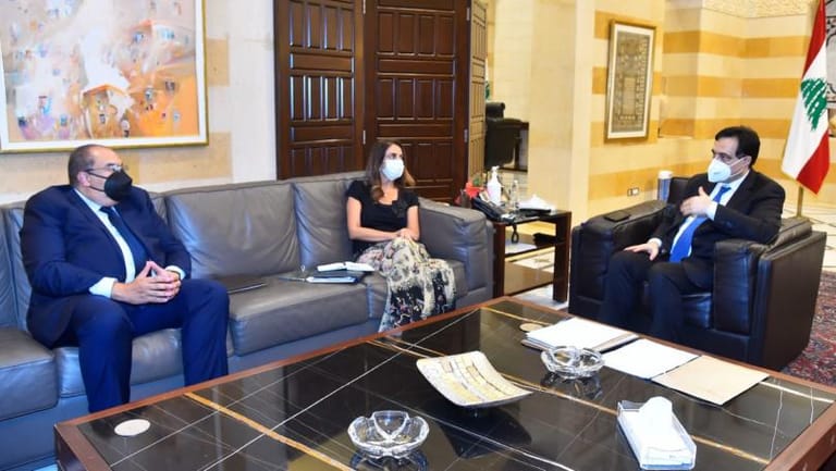 Caretaker Prime Minister, Hassan Diab, on Tuesday afternoon received at the Grand Serail the Executive Director of the International Monetary Fund, Mahmoud Mohieldin, and Minister Zeina Akar.