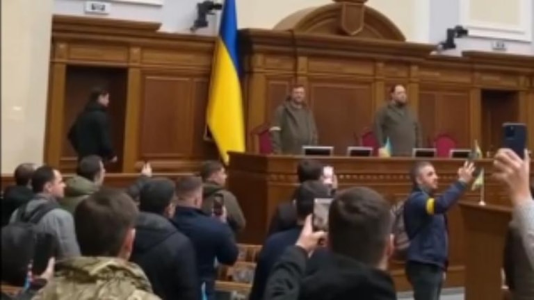 Amid the Russian bombing of Ukraine, the Ukrainian parliament held a meeting, and all attendees stood up to recite the Ukrainian anthem.