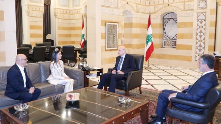 The PM then received the Caretaker Tourism Minister, Walid Nassar, accompanied by Miss Lebanon 2022 Yasmina Zaytoun.