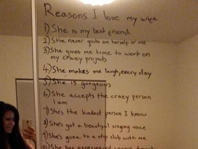 Molly Murphy posted a picture of a list of 15 items titled ‘Reasons I love my wife’ written by her husband on their bedroom mirror after she came home from a trip to San Francisco.
