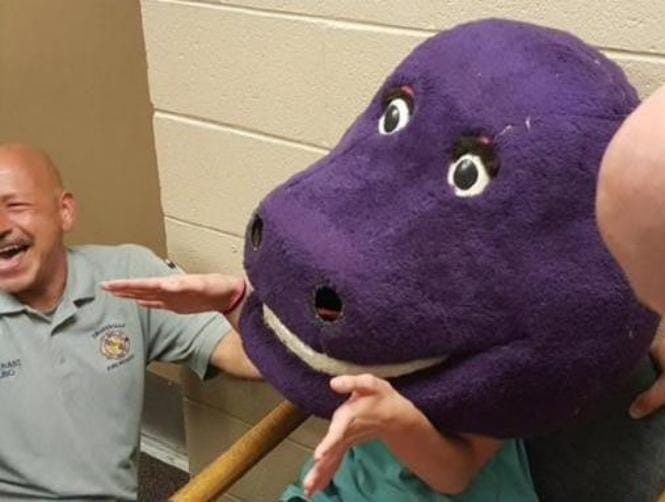 An Alabama teenager received some help at the local fire house after her head and shoulders became stuck inside a Barney dinosaur head.