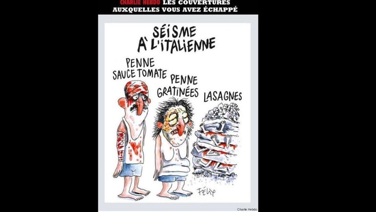 The cartoon titled "Earthquake Italian Style" compared the quake victims with typical dishes of the country. The caricature showed a man covered in blood standing with a sign over his head reading "penne in tomato sauce." The poor fellow is depicted next to a badly injured woman survivor who is labeled "penne au gratin." The icing on the satirical image shows people squashed in the rubble with feet sticking out between the floors of a collapsed building with the sign reading "Lasagna".