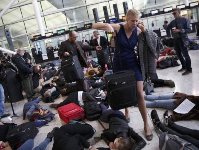 More than a hundred people demonstrated at London's Heathrow Airport on Saturday, including dozens who took part in a "die-in" at one terminal, just weeks before Prime Minister Theresa May's government is due to decide where to build a new runway.