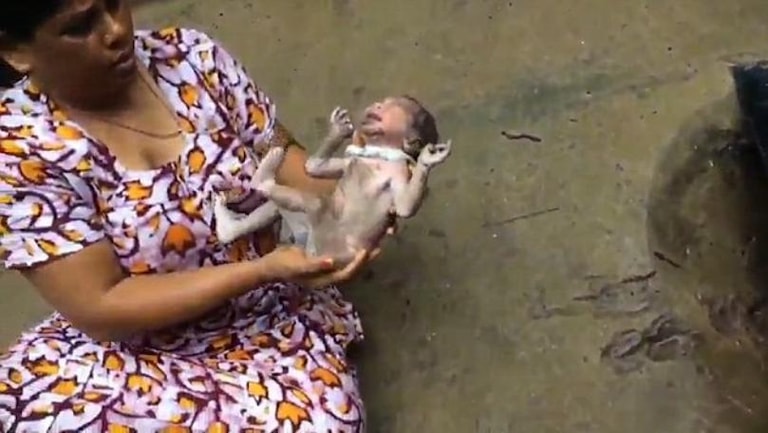 Harrowing footage shows a woman gently pulling the infant from the drain by his feet, before cleaning him in a bowl of water.