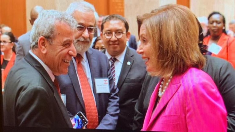 A Lebanese parliamentary delegation chaired by MP Ali Bazzi met Wednesday in Washington with US House Speaker Nancy Pelosi, to whom they conveyed a message from her counterpart Nabih Berri.