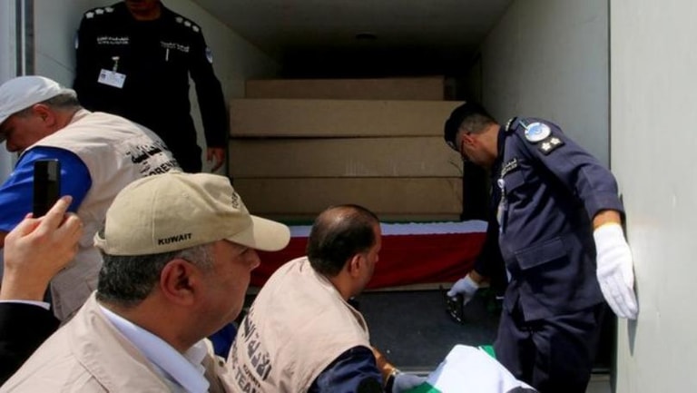 The handing over of remains, which were put in caskets wrapped in Kuwaiti flags, is the first since the toppling of Saddam Hussein in a U.S.-led invasion in 2003.