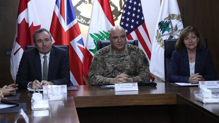 Lebanese Army Commander, General Joseph Aoun, on Tuesday presided over the meeting of the high-level steering committee of the Assistance Program for the protection of the Lebanese land borders, in Yarzeh, in presence of US Ambassador to Lebanon, Elizabeth Richard, UK Ambassador to Lebanon, Chris Rampling, Canadian Ambassador, Emmanuelle Lamoureux, along with members of the joint work team.