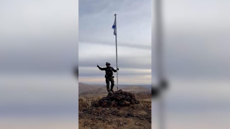 The Israeli enemy army raises its flag over a hill in the Syrian village of Al Khudr after seizing it.