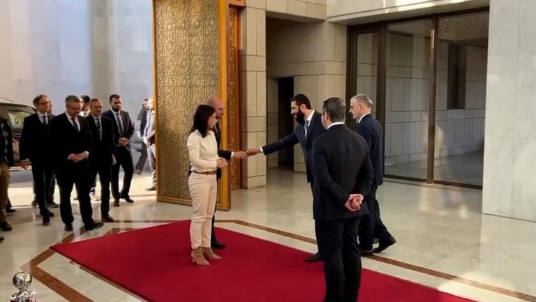 Her comments came after a video surfaced showing her, alongside her French counterpart Jean-Noël Barrot, being received by Syrian leaders, where officials from the new administration refrained from shaking her hand. Even al-Sharaa, the head of the new administration, did not shake her hand.