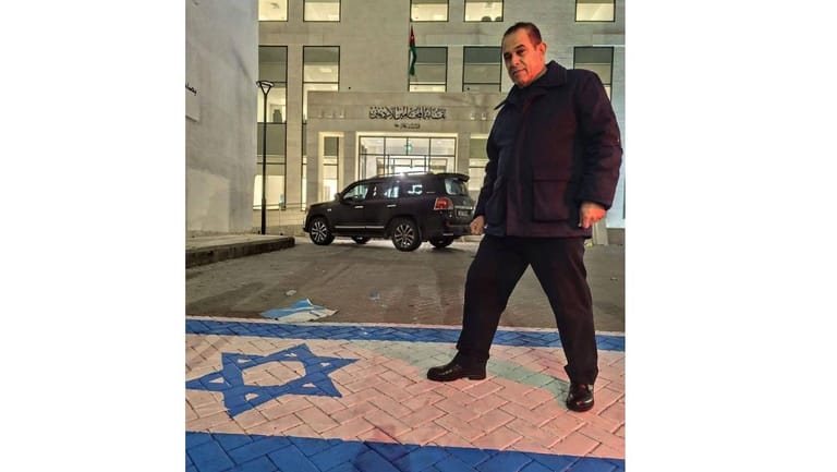 A photo circulated on social media showing the deputy head of the Jordanian Bar Association stepping on the Israeli flag at the entrance of the association's headquarters in the Jordanian capital, Amman.