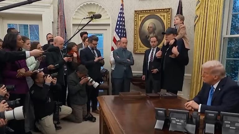 The child wandered around the Oval Office, imitating his billionaire father, while the president was signing an executive order to reshape the federal workforce. Musk's son was seen smiling, climbing on his father's shoulders, mimicking him, and making the reporters laugh as Trump and Musk spoke to them.