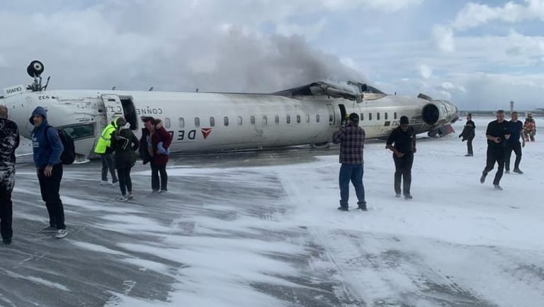 A passenger plane crashed while landing at Toronto Airport in Canada, catching fire, which resulted in 8 injuries.