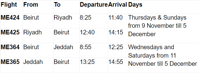 Middle East Airlines - Air Liban announces that it will be operating extra morning flights (in addition to the current night flights) to Jeddah and Riyadh.
