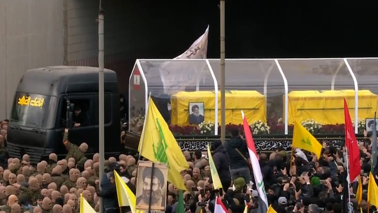 After the funeral prayers for Hezbollah's former Secretaries-General, Sayyed Hassan Nasrallah and Hashem Safieddine, mourners proceeded behind the two coffins toward the burial site, where a red carpet was laid and surrounded by flowers.