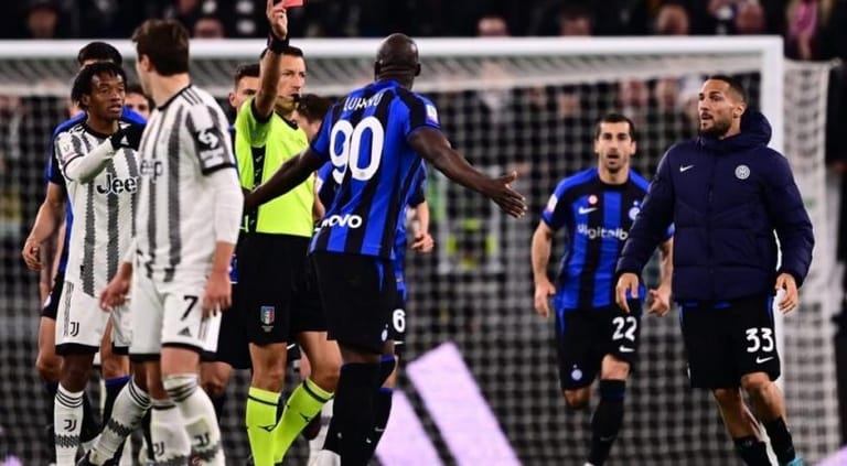 The striker received a second yellow card for celebrating a late equaliser for Inter Milan in an Italian Cup semi-final by turning to Juventus fans, who had been abusing him racially, and holding a finger to his lips.