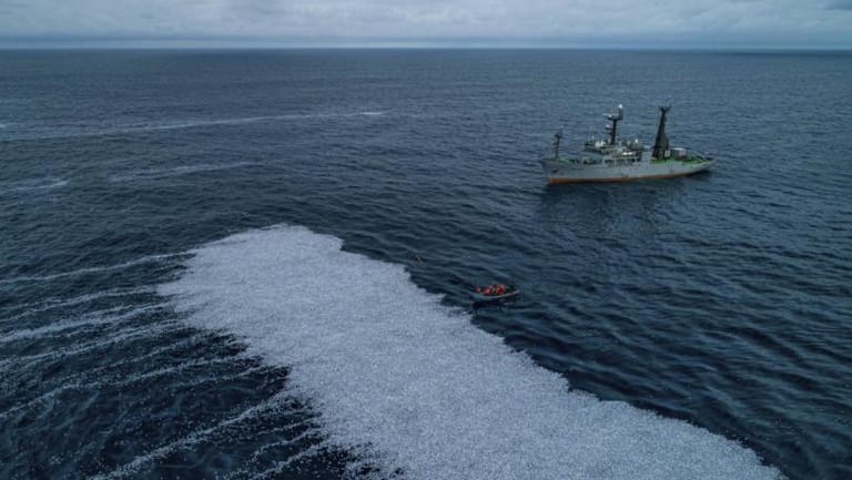 The French arm of campaign group Sea Shepherd first published images of the spill, showing the ocean's surface covered by a 3,000 sq m (32,300 sq ft) blanket of blue whiting, a sub-species of cod, used to mass-produce fish fingers, fish oil and meal.