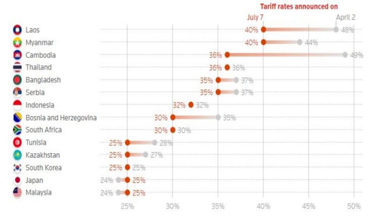 Trump said the United States would impose tariffs of 25% on goods from Tunisia, Malaysia and Kazakhstan, with levies of 30% on South Africa, Bosnia and Herzegovina, climbing to 32% on Indonesia, 35% on Serbia and Bangladesh, 36% on Cambodia and Thailand and 40% on Laos and Myanmar. A deal with India was close, Trump added.